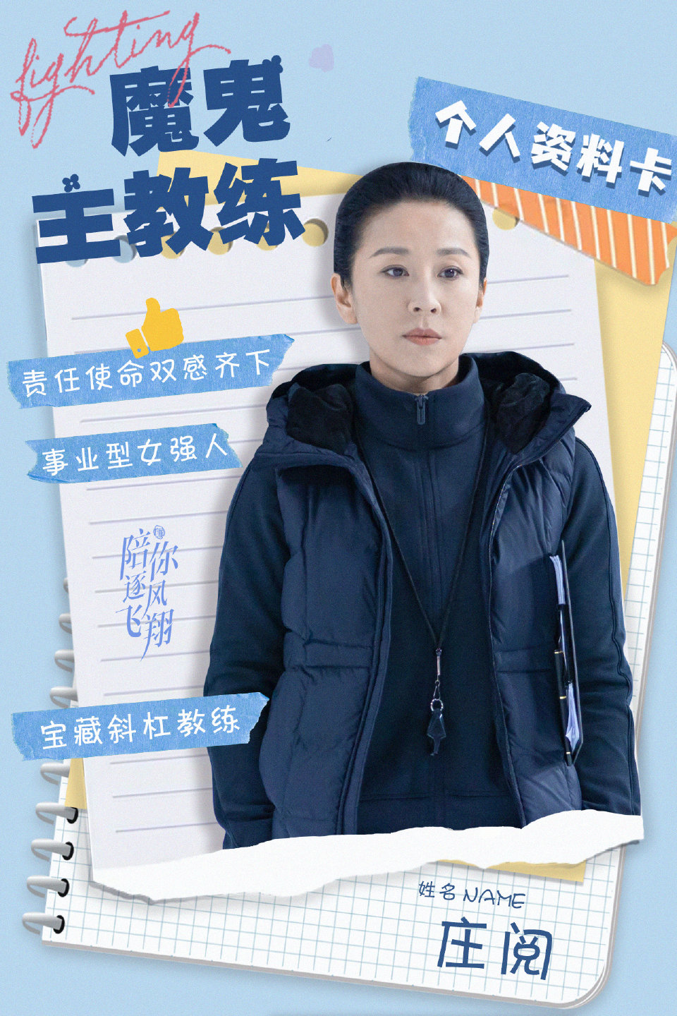 샤오베이셩의 어머니, 축풍팀 여자 단거리 코치, 예전에는 여자 단거리 쇼트트랙 선수이자 해외에서 유명한 선수였다, 자신의 노력으로 축풍팀의 저조한 실력을 전환시키고 싶어한다. 후에 젊었을 때 션정이의 어머니와 같은 성의 팀이자 션정이 어머니를 다치게 만든 팀원이었다는 것을 알게 된다.